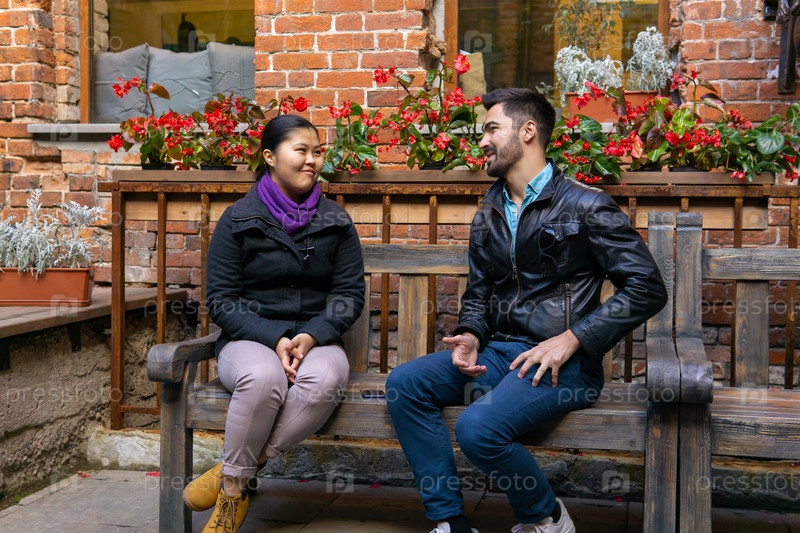 Молодой мужчина и женщина разговаривают, сидя на скамейке на открытом воздухе