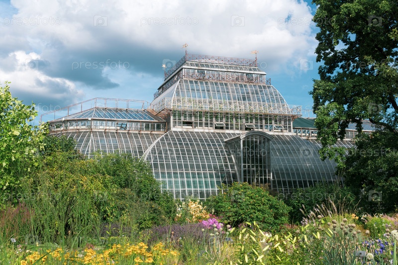 Вид на Ботанический сад Санкт-Петербурга с клумбами и старинной пальмовой оранжереей на заднем плане