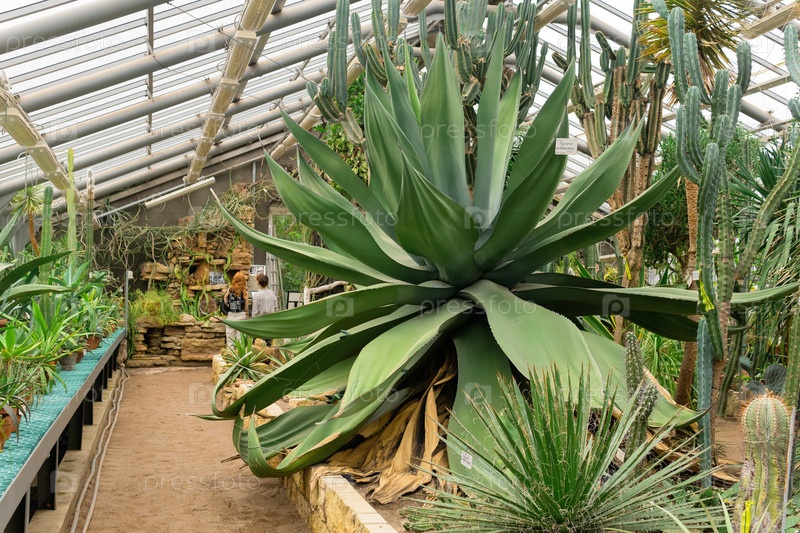 Интерьер оранжереи ботанического сада с огромной агавой и древовидными кактусами