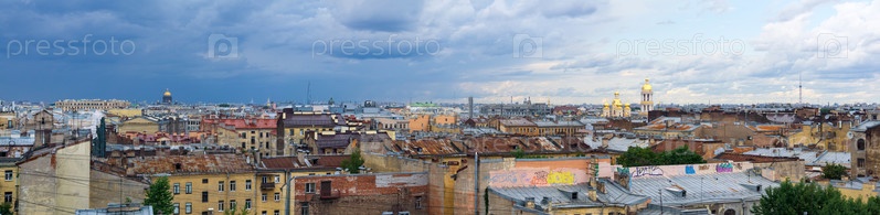 Панорамный вид сверху на городские крыши в историческом центре Санкт-Петербурга перед началом грозы