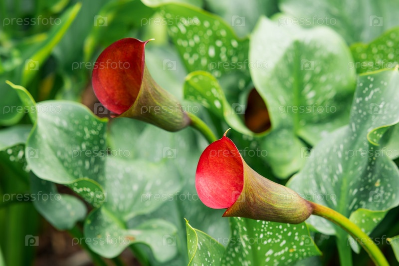 Красивый красный цветок каллы крупным планом на зеленом естественном фоне