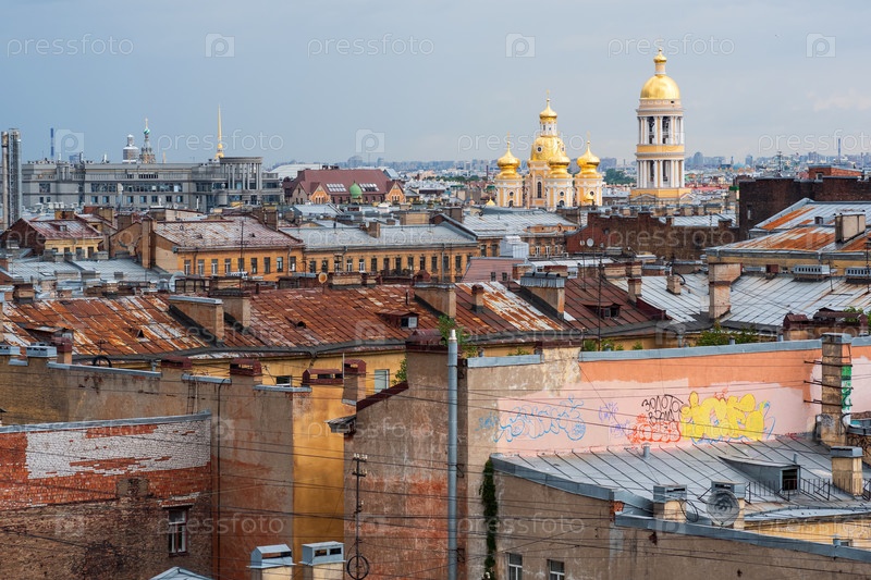 Вид на крыши исторического центра Санкт-Петербурга во время дождя