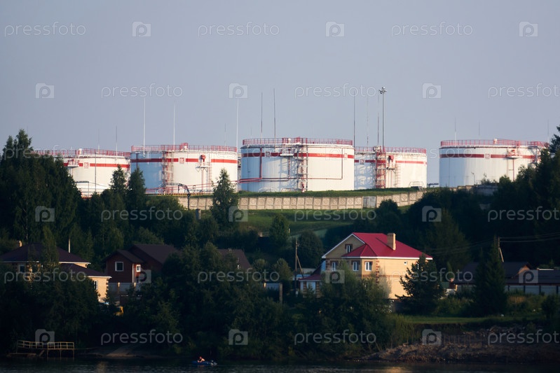 Нефтехранилище на холме над деревней на берегу в Перми, Россия