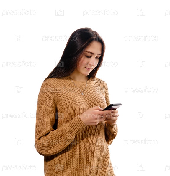 Молодая женщина смотрит на экран своего телефона, изолированный на белом фоне