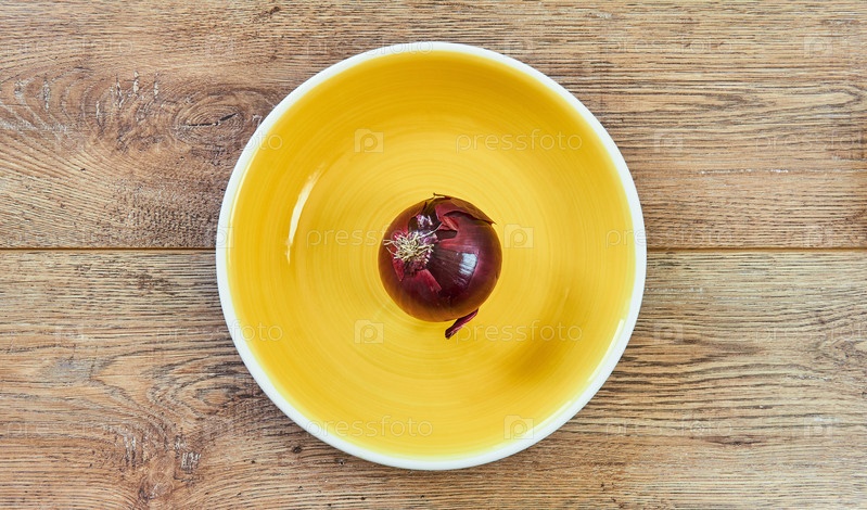 Фиолетовая луковица красного сладкого лука на желтой тарелке на деревянном столе
