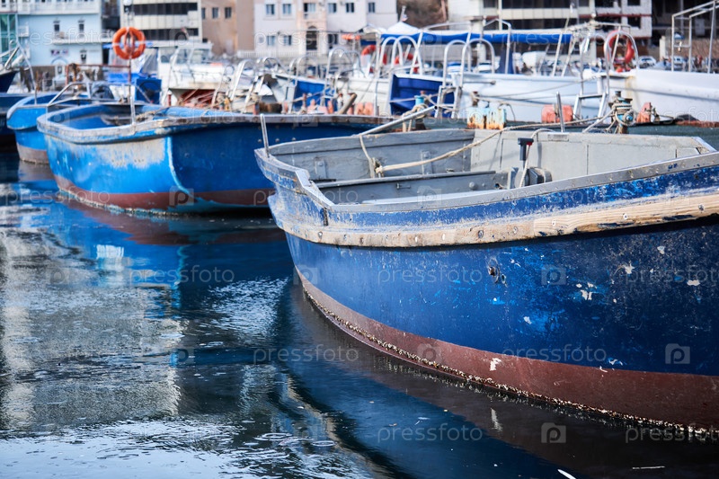 Фон - маленькие синие рыбацкие лодки в гавани