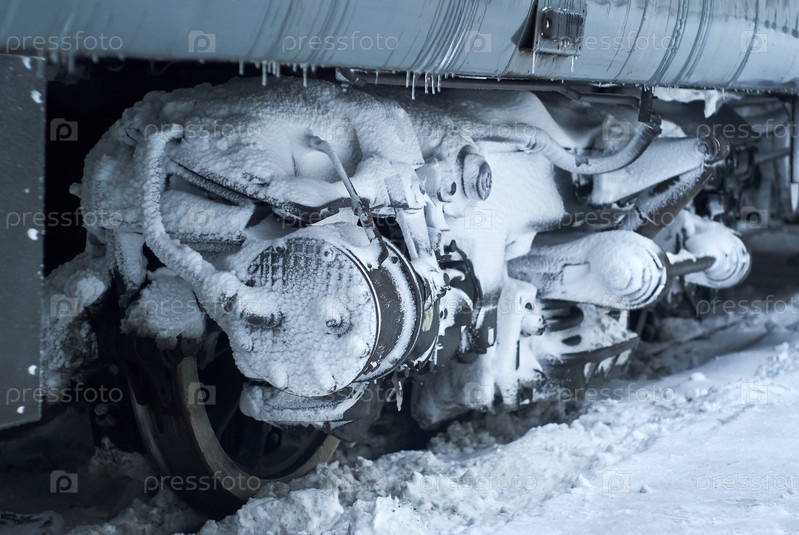 Покрытая льдом тележка железнодорожного пассажирского вагона на рельсах зимой