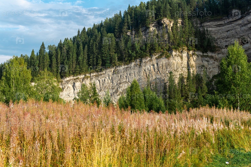 Осенний пейзаж с лесистыми известняковыми скалами на заднем плане на Среднем Урале, Россия