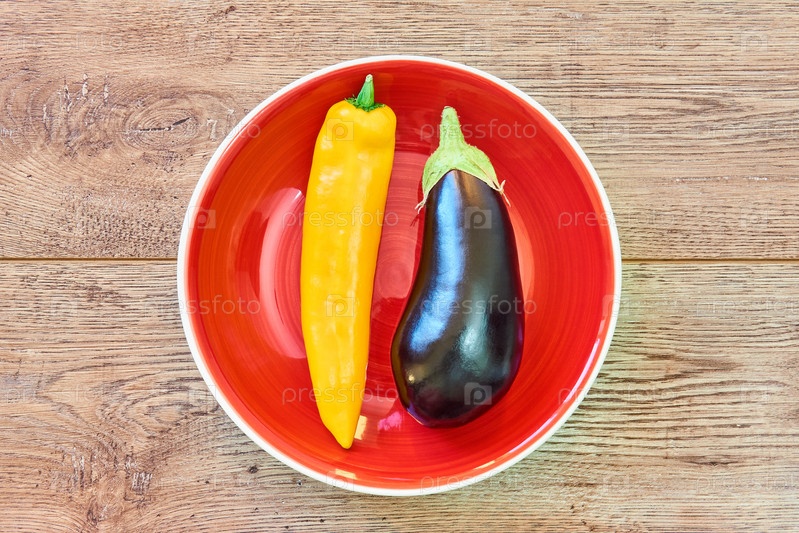 Стручок желтого перца и почти черного баклажана на красной тарелке на деревянном столе