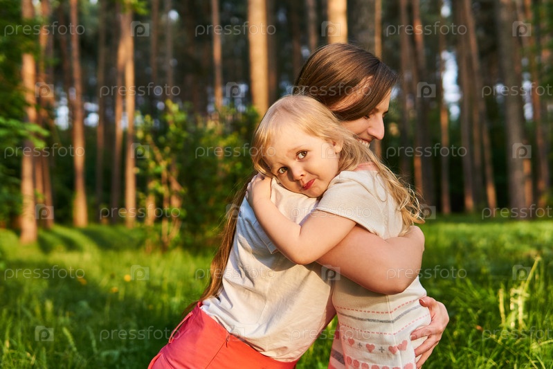 Дочь-малыш обнимает маму на улице
