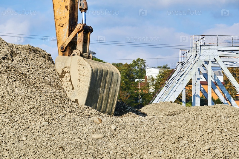 Дноуглубительные работы - ковш экскаватора на куче почвы перед железнодорожным мостом через реку