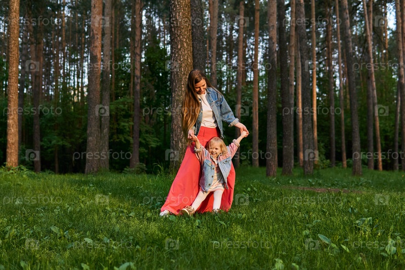 Женщина с маленькой дочерью танцует на лужайке в парке