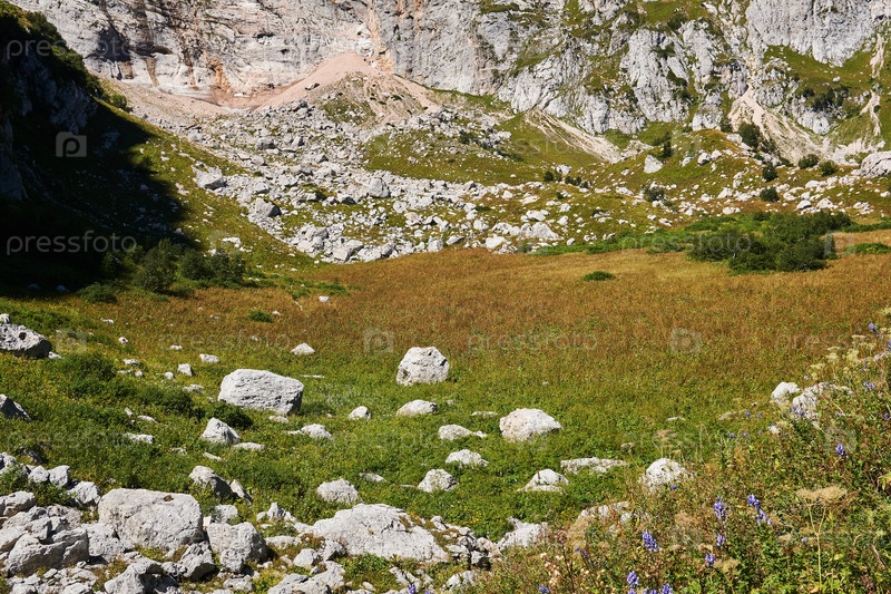 Небольшая долина среди отвесных скал с осенним альпийским лугом