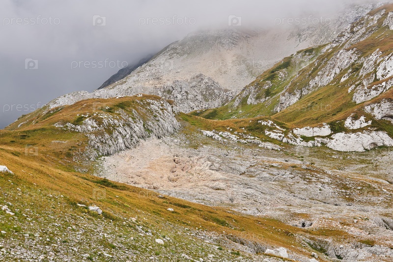 Альпийский травянистый туманный пейзаж с каменными полями вместо растаявших ледников