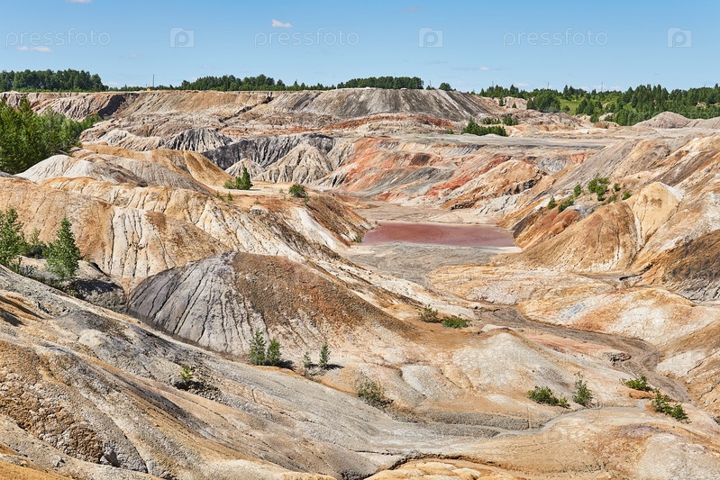 Пустынная местность с красным озером на месте старого глиняного карьера