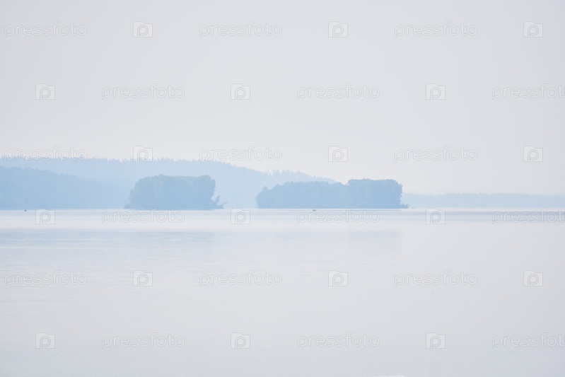 Светлый размытый фон, пейзаж - далекие острова в утреннем тумане