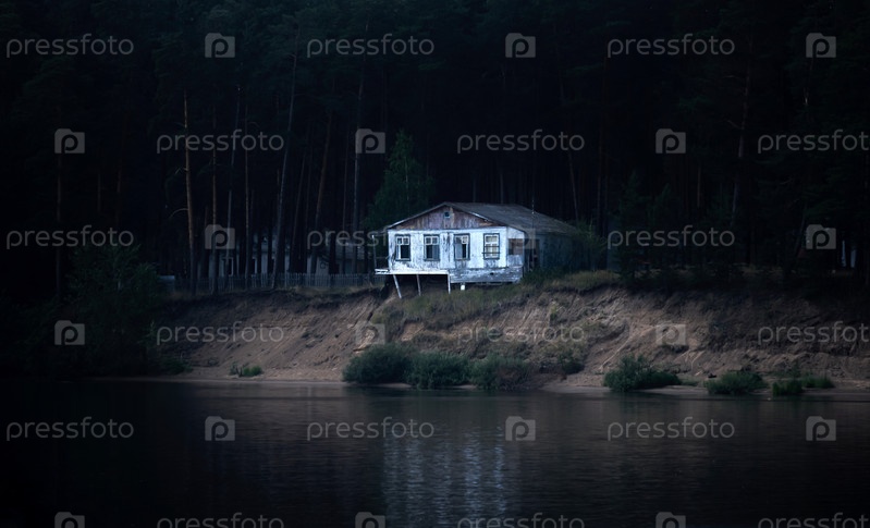 Заброшенный полуразрушенный дом на темном лесистом берегу чуть не рухнул в реку