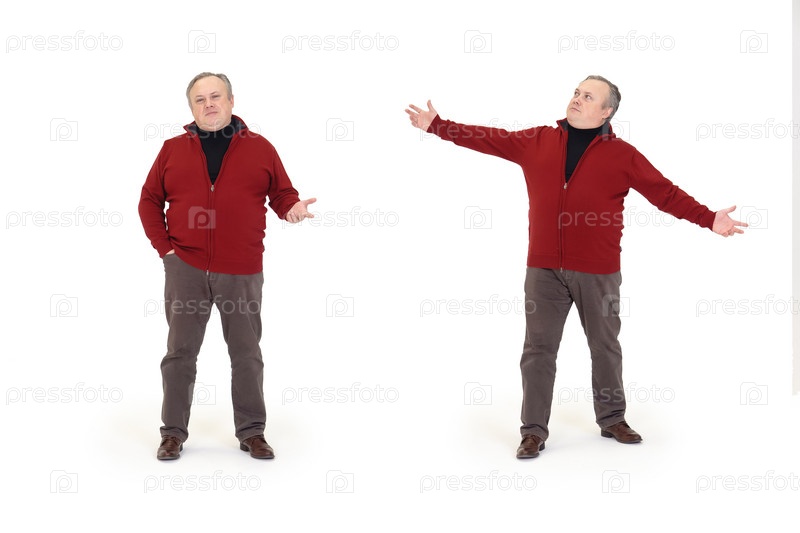 Мужчина разговаривает и жестикулирует в полный рост на белом фоне