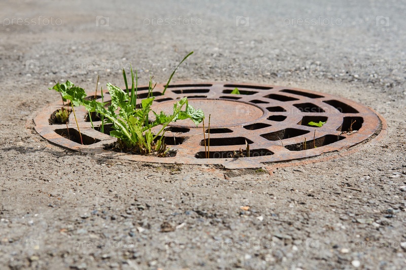 Чахлая растительность пробивается сквозь решетчатый люк ливневой канализации посреди асфальта