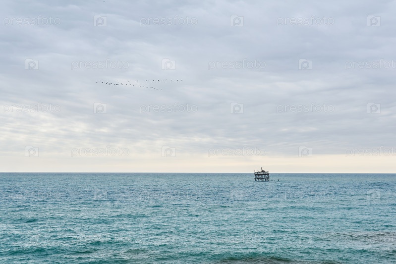 Морской пейзаж с аквакультурной установкой вдалеке и стаей птиц в облачном небе