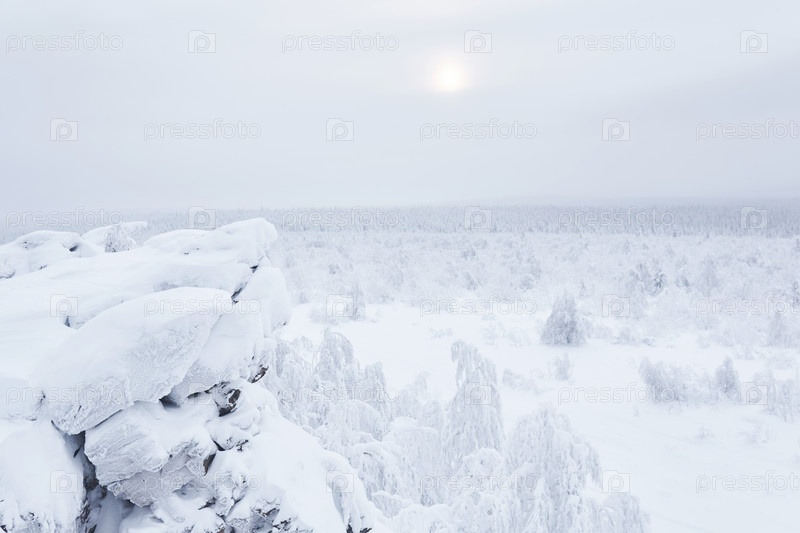 Зимний вид со скалистого горного хребта на заснеженные лесистые холмы в морозном тумане