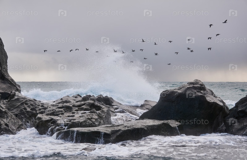 Стая бакланов летит над морем за бурным прибоем и прибрежными скалами