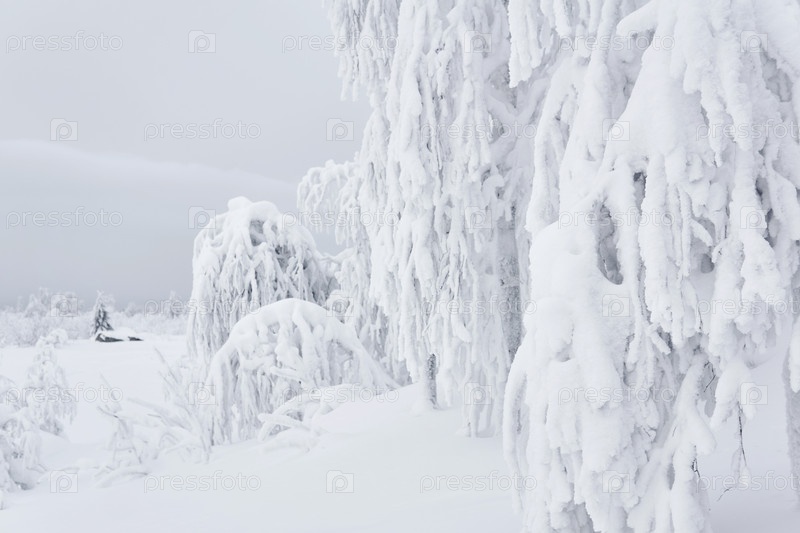 Деревья и кустарники, покрытые снегом после метели на фоне туманного морозного пейзажа