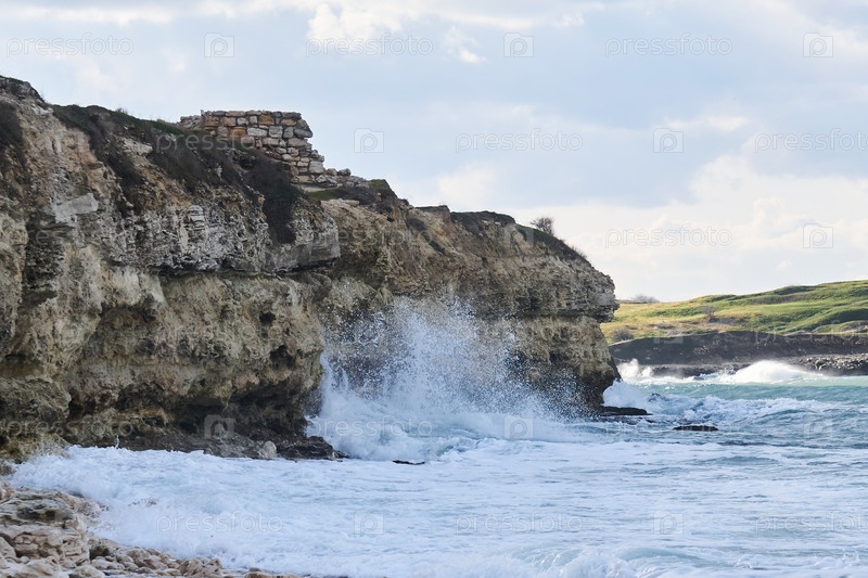 Морской прибой разрушает скалу с руинами древнего здания на ней