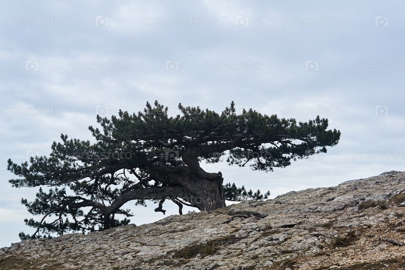 Причудливая кривая сосна на камнях на краю пропасти