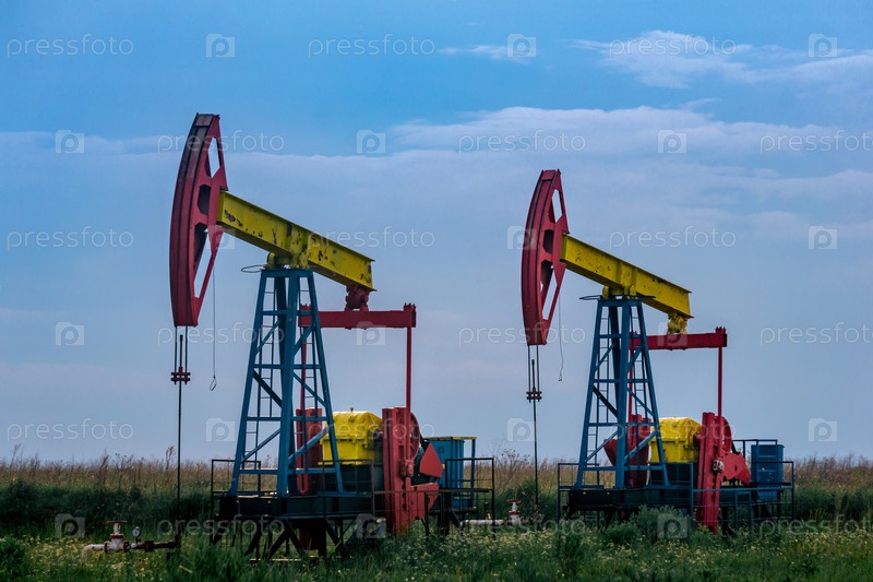 Насосные машины, работающие на нефтяной скважине в поле на открытом воздухе