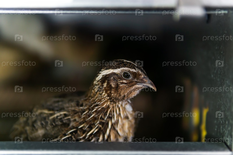 Домашних перепелов держат в клетке в курятнике, крупным планом