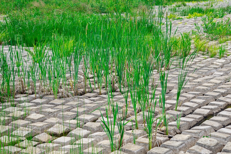 Местность, покрытая гибким бетонным матом для предотвращения эрозии, уложенным на землю, сквозь который растут растения