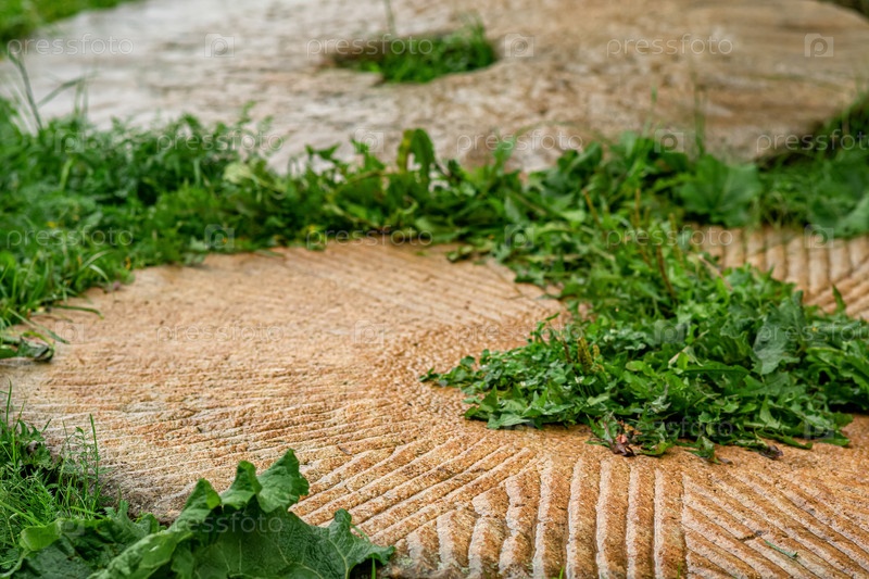 Старый разбитый жернов лежит на траве где-то в сельской местности