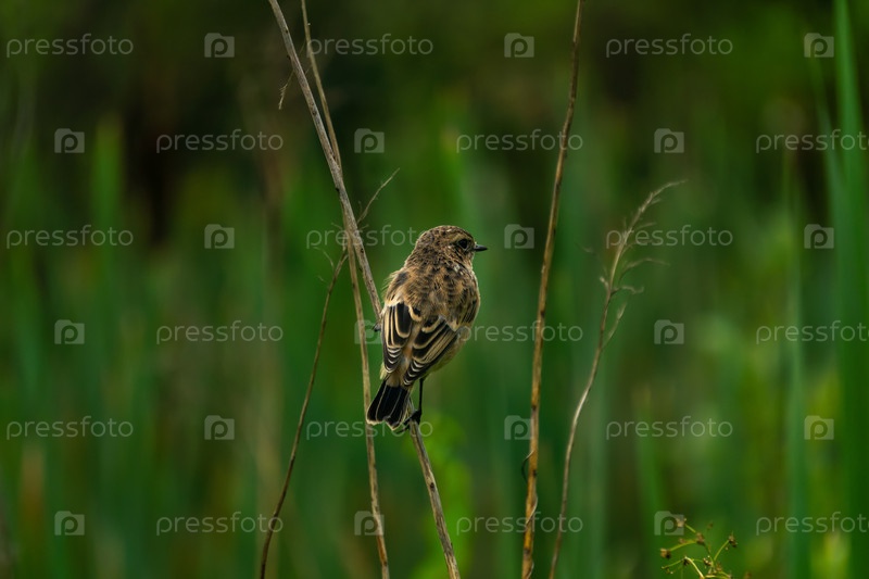 Птичий чат сидит на стебле растения на размытом естественном фоне