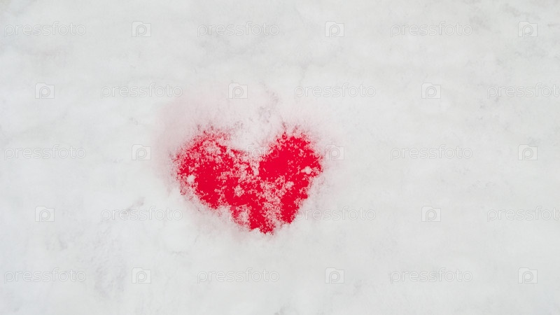 Нарисованное красное сердце на снегу, форма сердца зимой. Валентинка, признание в любви, нежность, искренность. Место для текста