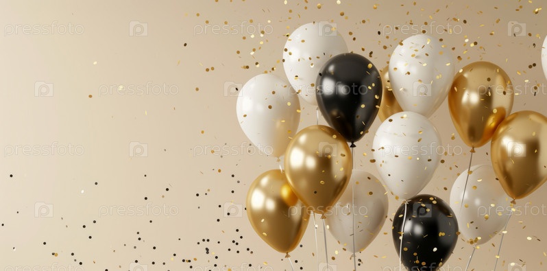 Фон с днем рождения с реалистичным воздушным шаром и золотым конфетти