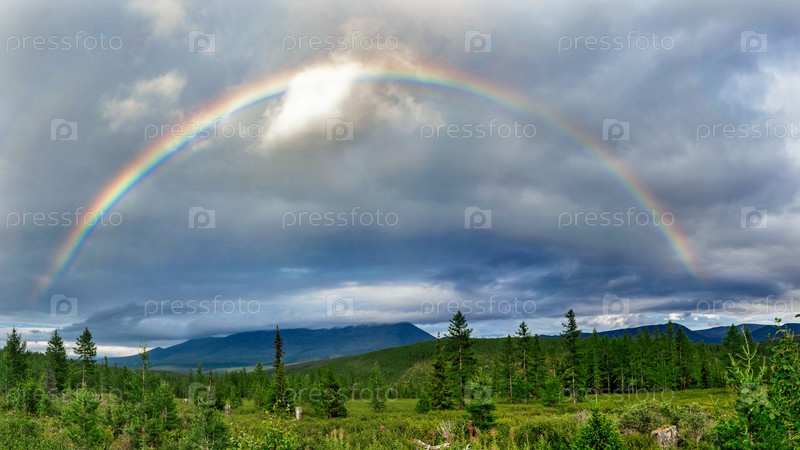 Радуга над горами и лесом в пасмурный летний день