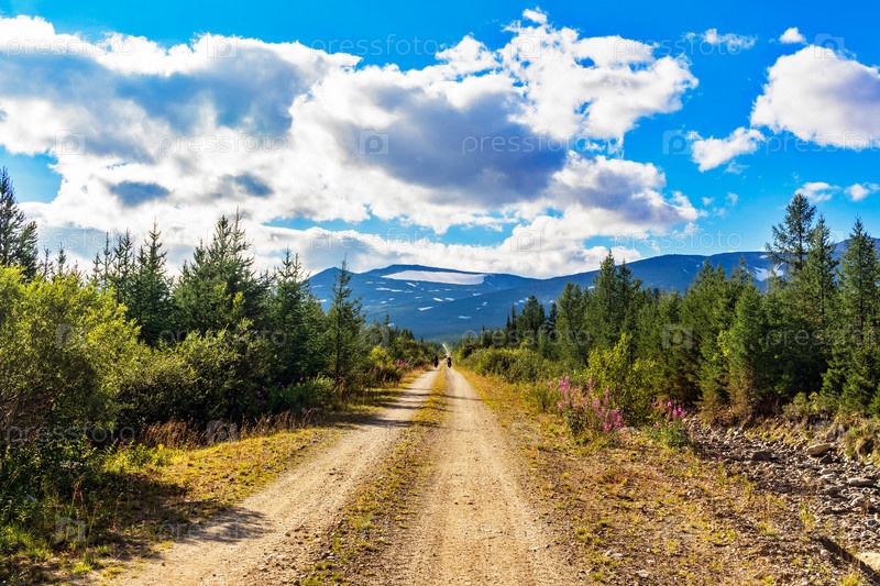 Грунтовая дорога через хвойный лес в горы