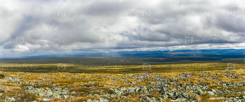Каменистая тундра и тайга на расстоянии в дождливый день