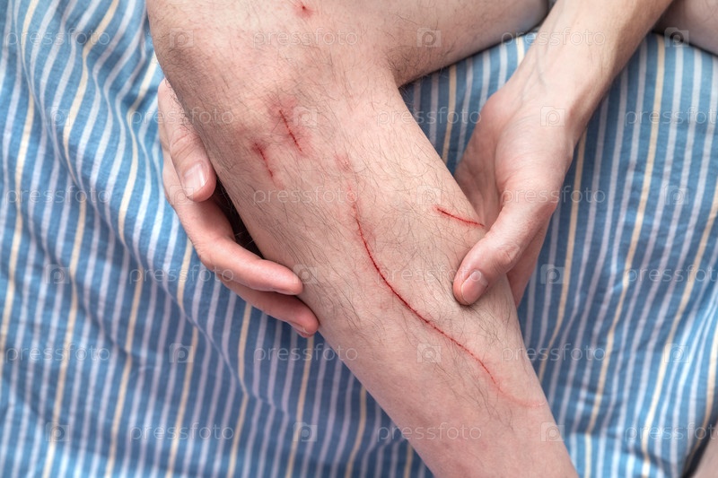 Свежие раны от кошачьих когтей. Царапанная рана на ноге мужчины
