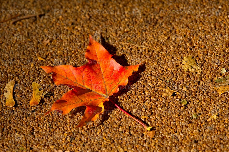 Москва. Россия. Одинокий кленовый лист в осенних ярких красках на пешеходной дорожке городского парка Покровское-Стрешнево