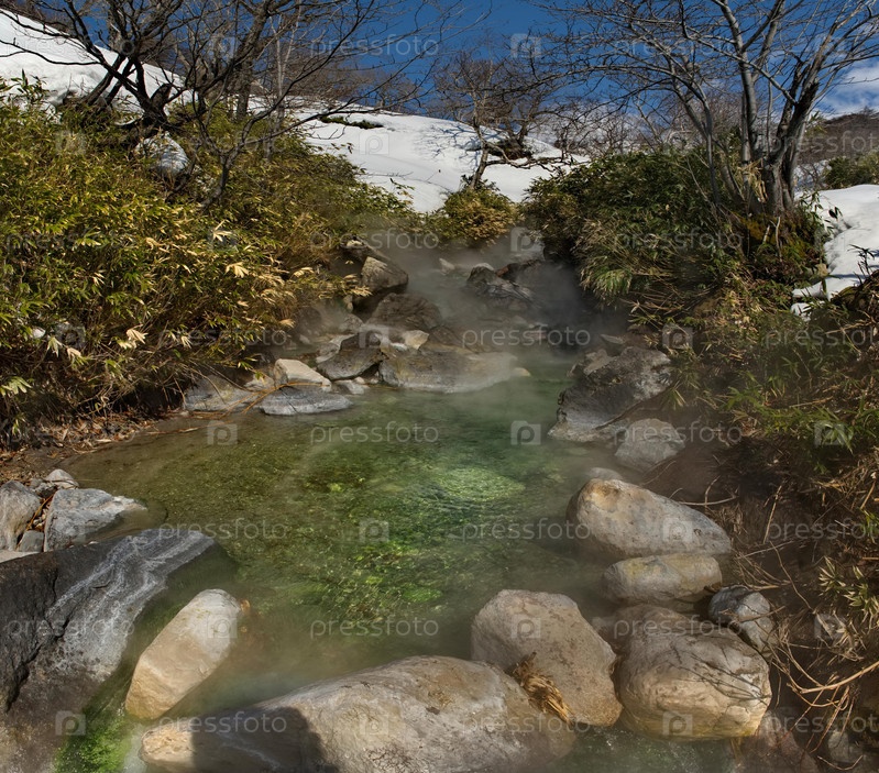 Россия. Курильские острова. Термальный источник (Кипящая река) близ вулкана Барановский имеет живописный ярко-изумрудный цвет. Температура воды в ваннах достигает 40 градусов