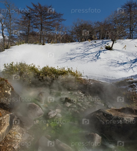 Россия. Курильские острова. Термальный источник (Кипящая река) близ вулкана Барановский имеет живописный ярко-изумрудный цвет. Температура воды в ваннах достигает 40 градусов