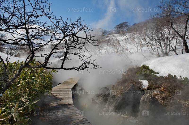 Россия. Курильские острова. Термальный источник (Кипящая река) близ вулкана Барановский имеет живописный ярко-изумрудный цвет. Температура воды в ваннах достигает 40 градусов