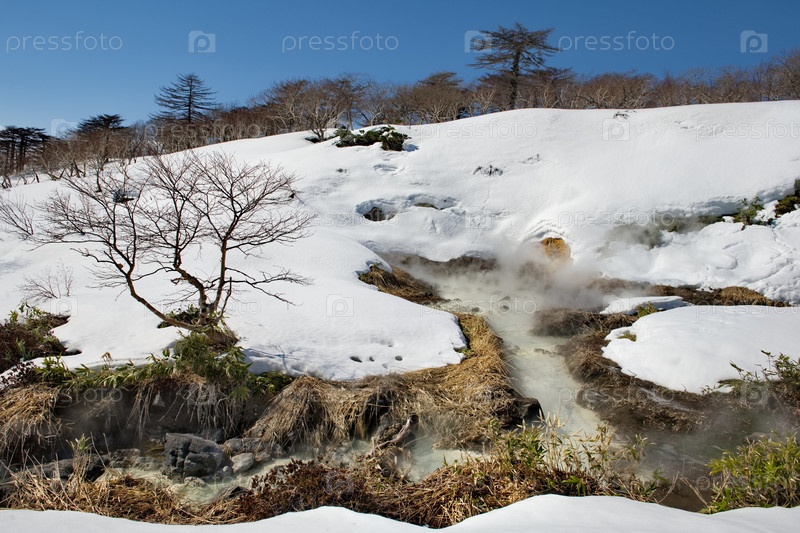 Россия. Курильские острова. Термальный источник (Кипящая река) близ вулкана Барановский имеет живописный ярко-изумрудный цвет. Температура воды в ваннах достигает 40 градусов