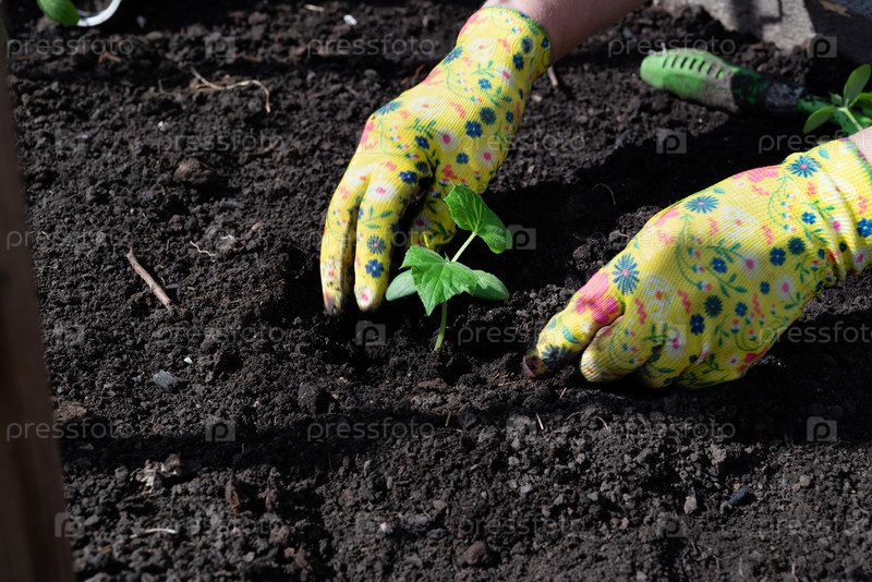 Женские руки в садовых перчатках держат саженцы огурцов перед посадкой в почву, место для текста