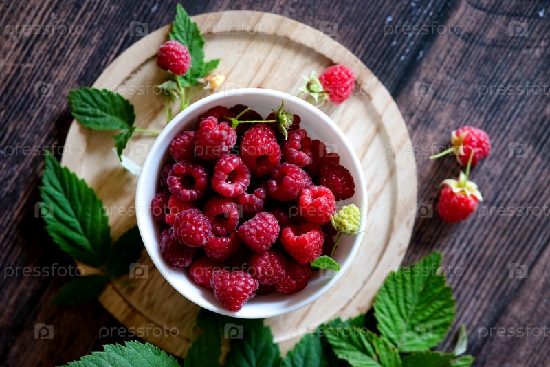 Чашка, полная свежей спелой садовой малины на темном деревенском фоне. Небольшая глубина резкости с местом для копирования текста