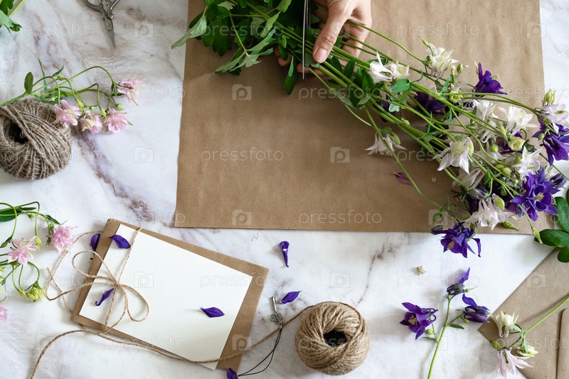 Крупный план рук молодой женщины-флориста, создающей приглашение, вложенной в конверт с цветущими цветами, вид сверху. Макро. Изолированные на белом фоне. Со свободным местом для вашего текста