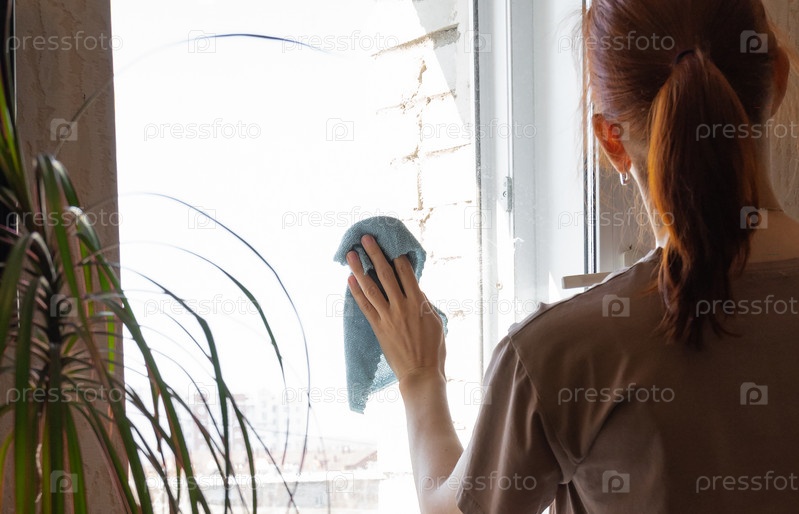 Молодая улыбающаяся женщина моет окно губкой. Счастливая красивая девушка в защитных перчатках чистит окно распылением чистящих средств и протиранием губкой. Женщина, убирающая дом
