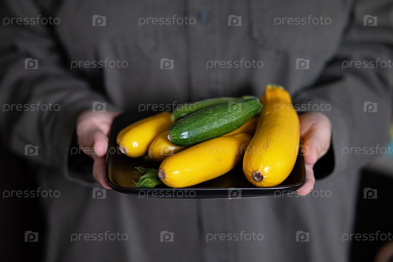 Руки держат большую тарелку с различными свежими фермерскими овощами. Диета. Баланс. Концепция здоровой органической пищи